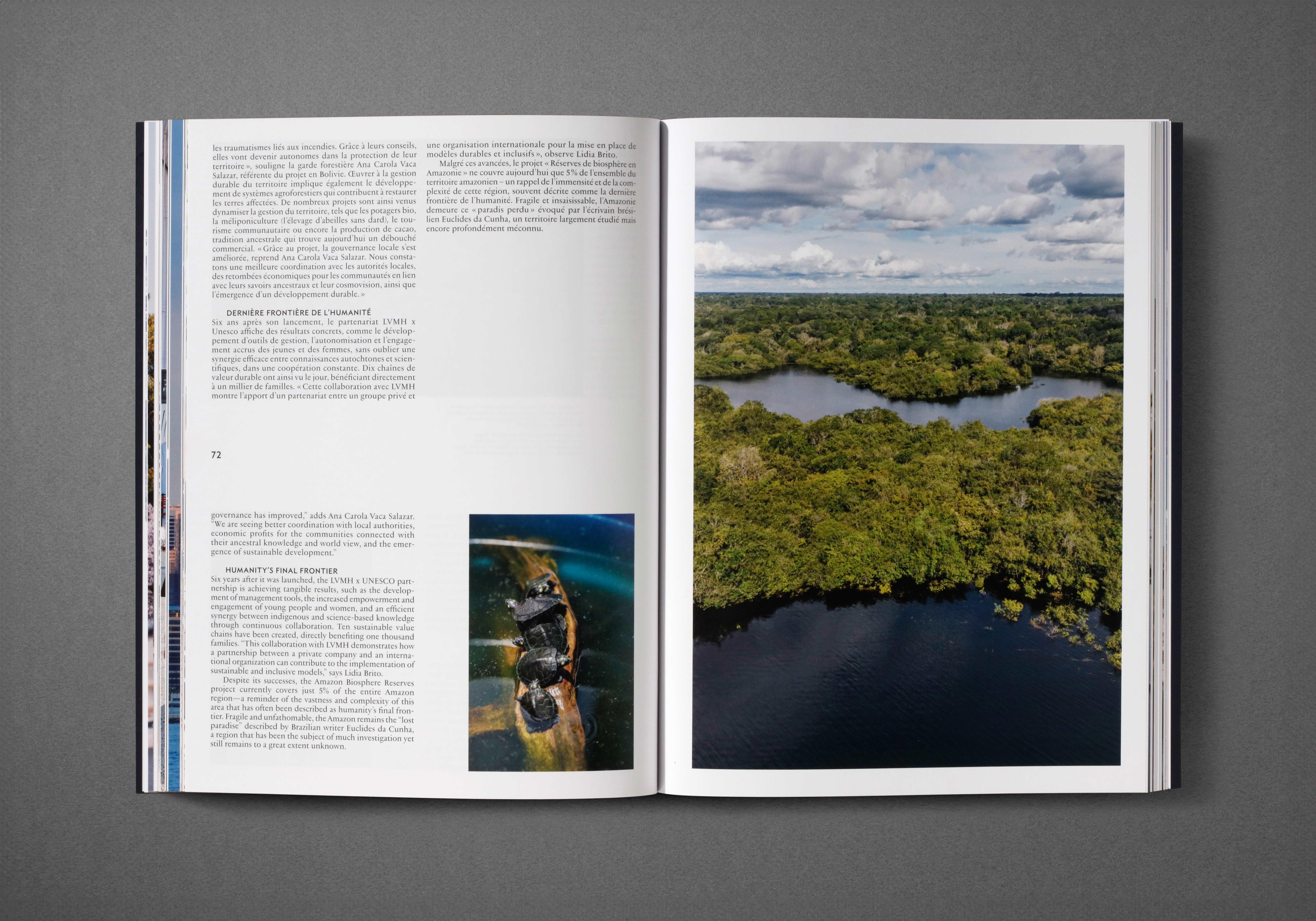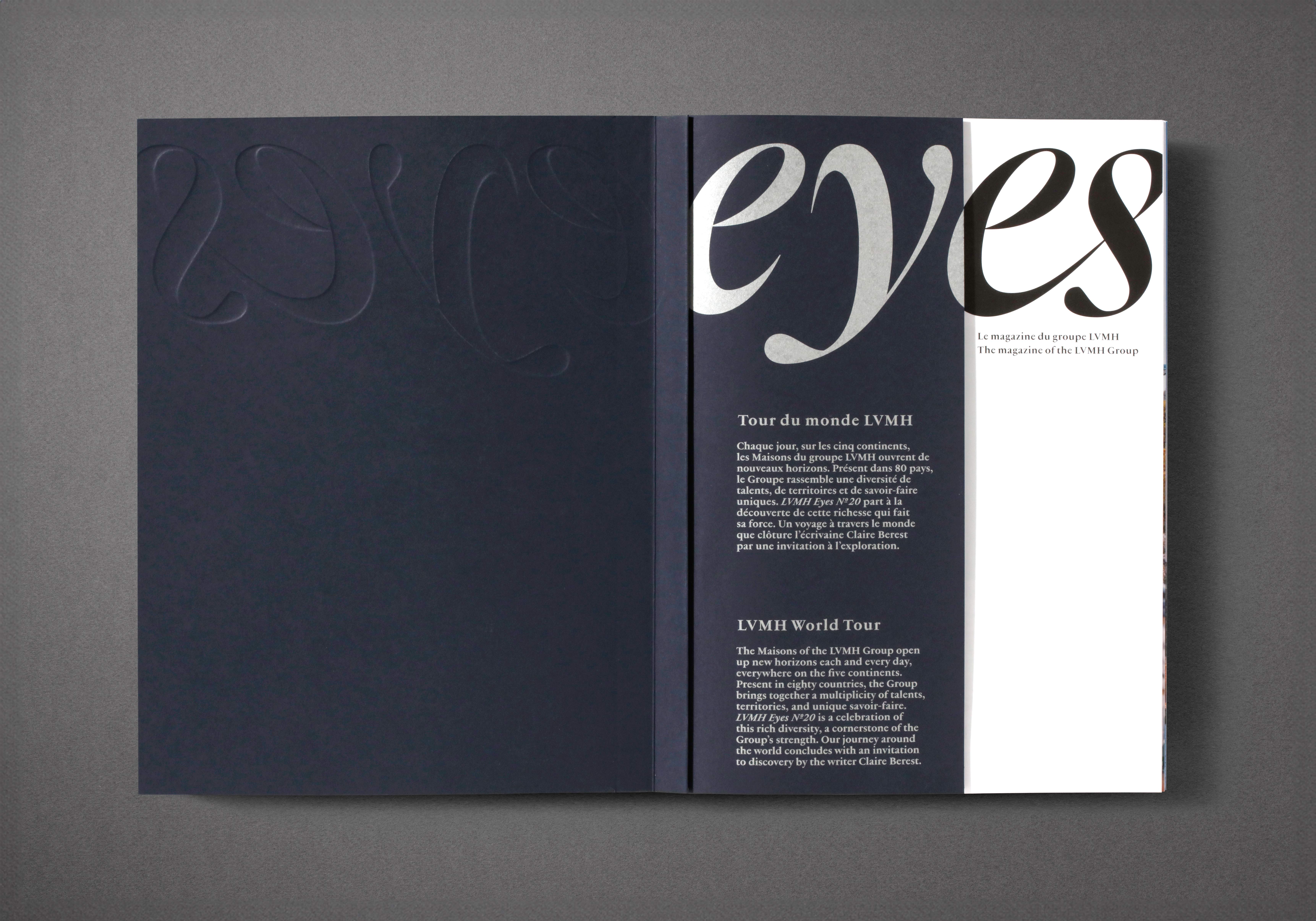 Publié annuellement, Eyes est un magazine interne destiné aux Maisons LVMH à travers le monde. Cette publication partage les différentes initiatives et les grands enjeux auxquels le Groupe fait face. Avec sa reliure unique, inspirée des carnets de route, les différentes illustrations originales de l’illustratrice Manon Diemer ce numéro invite à l’exploration.